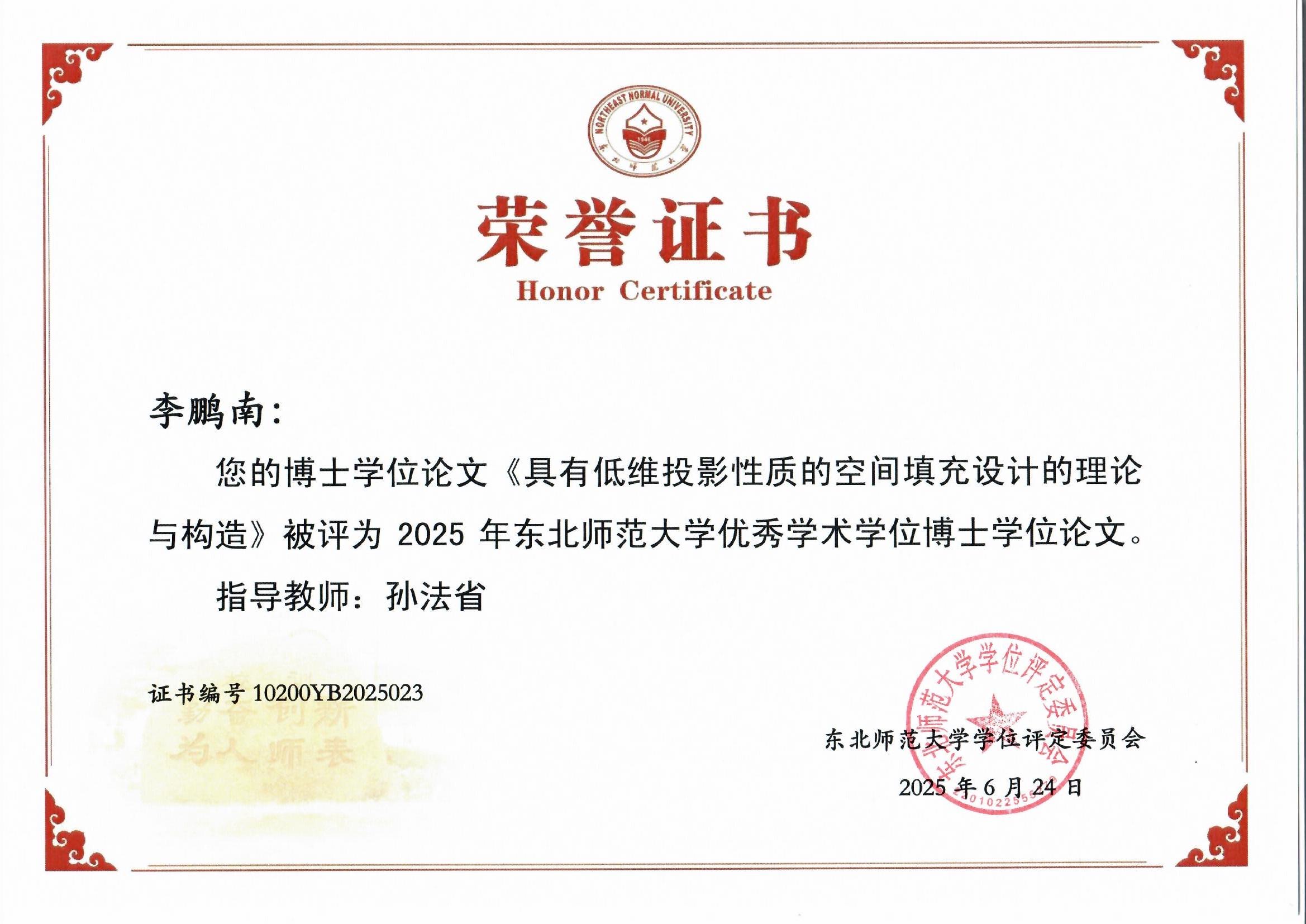 - 2023年 李鹏南 博士生(2020年9月-2024年7月) "中国数学会均匀设计分会第十六届学术研讨会"优秀论文二等奖